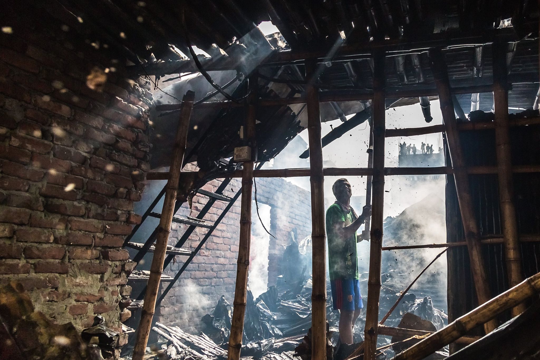ততক্ষণে হুলুস্থুলু শেষ হয়-হয়। সাড়ে ১১ কী ১২টার মতো বাজে-টাজে। আগুন অনেকটা নাই-নাই। তবে ধোঁয়া ছিলো। কারণ আগুনটা সেই সকাল সাড়ে ৮টায় লাগছিলো। সেই বিশাল এলাকার প্রায় সব জ্বালায় ছারখার কইরা বসায়া দিছে। তিনতলা একটা টিনশেড ঘর ছিলো, সেইটারেও জ্বালায় ছনঘরের মতোই ছাইয়ের মতো বানায়া প্রায় মিশায় দিছে। বিধ্বস্ত টিনগুলা আগুনের আঁচে ত্যারায়বেকায় চেগায়ম্যাগায় গেছে। গেলে দেখা যায় যে কাটাসুর বস্তির বিস্তারটা অনেকটা ইংরেজি বর্ণমালা ‘এল’ শেইপের মতো কইরে। আগুন, অনেক সময়ই যা শুনা যায় ইলেক্ট্রিক শর্টসার্কিট থেইকে নাইলে কয়েল পোড়া থেইকে ভায়া মশারি দিয়া ঘিঞ্জি ঘরগুলায় একটার পর একটায় ছড়ায় গেছিলো। একজন বস্তিবাসিন্দার হালকা বিবরণের কথা মনে আসে কিছুটা। উনি বলছিলেন, সকাল ৮টা কি সোয়া ৮টার দিকে তখন ঘুমাচ্ছিলেন। হঠাৎ শোনেন জানালার কাঁচে কে যেন বাড়ি দিয়ে যাচ্ছে। উনি পাত্তা দেন নাই। পরে বারে বারে আঘাত লাগার শব্দ আর চেঁচামেচিতে উঠে পর্দা সরায় দেখেন যে সামনের টিনশেডটা প্রচুর খড়ে আগুন লাগলে যেমনে জ্বলে তেমনে দাউদাউ জ্বলতেছে। সেই আগ্নেয় শিখা তার ঘরের জানালায় বাড়ি দিচ্ছে। বলতে বলতে জানালার উপর ড্রেনেজ পাইপের লাইনটাও আমারে দেখায় দিলেন।