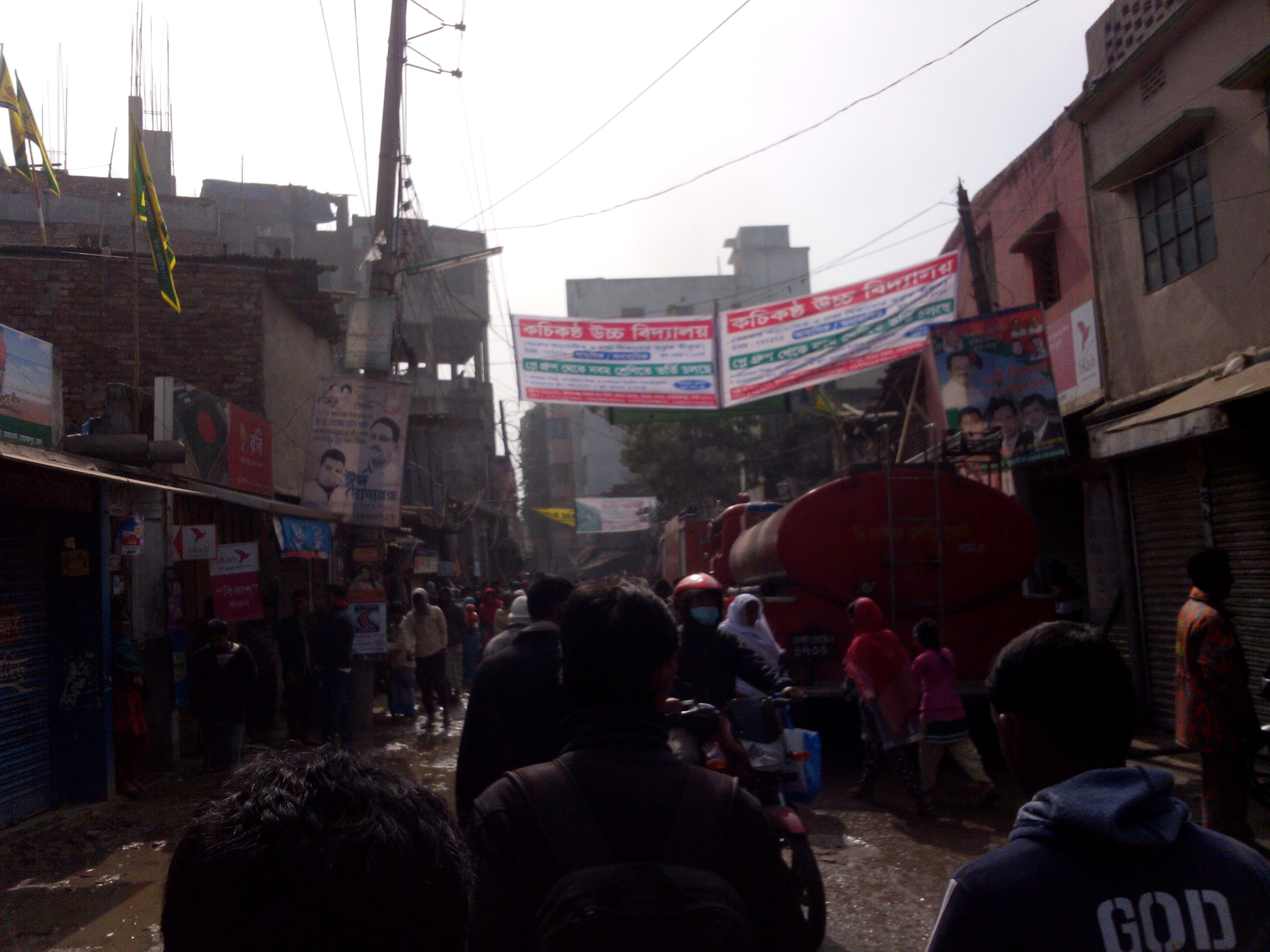 সেই দৃশ্যটা দেইখে স্মরণ আসলো যে, আরে সকালেই টিভির কোনো চ্যানেলের খবরে দেখাচ্ছিলো মোহাম্মদপুরে কাটাসুর নামের কোনো এক বস্তিতে আগুন লাগছে! অতএব ‘ঢাকাওয়াকার্স’ ঠিক করলাম, লে ভাই! চল যাই! আগে তো এইগুলা ভ্রমণে যাই নাই! দেইখে আসি তো কাহিনীটা কী!