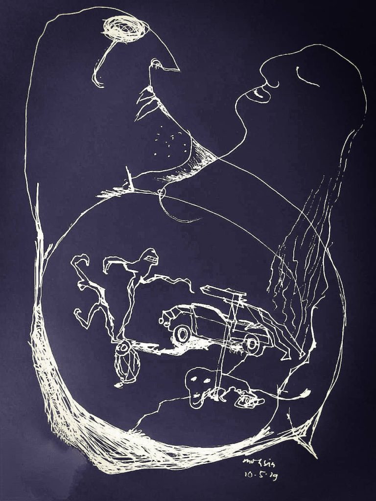 আস্তে আস্তে আগে বাড়তে থাকে ঘ্যাসুংগিঢ়া। বাতাস, মৌমাছির বিড়বিড় সব বন্ধ। রকেটের কথা মনে হইতাছে, আপন মনে হইতাছে খুব রকেট রে। রকেট না থাকলে এতক্ষণে তওলাপাড়ে পৌছায়া যাইতাম শিওর। রকেটের চোখটা মনে হইতাছে খুব, সবসমে কিছু একটা কইতে চায়। দোয়া দরুদ কিচ্ছু মনে নাই, কারে ডাকুম বুঝতাছি না। ঘ্যাসুংগিঢ়া আগাইতাছে, আমি একই জায়গায় জইমা রইছি দেওয়ালের লগে সাঁইটা। ঘ্যাসু হাত দিয়া ড্রেনের ময়লা লাড়তাছে, বিড়বিড় করতাছে আর চোখ ঘুরাইতাছে। আমার কান বন্ধ হয়া যাইতাছে, কিছু হুনতাছি না। সব কেমন জানি ঝাপসা লাগতাছে, আমি কি মইরা যাইতাছি তাইলে?