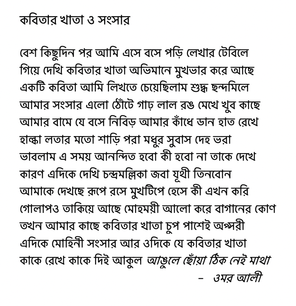 ওমর আলী: এটা আমার মনে হয় যে আমি যে কবিতাগুলো লিখেছি, সেগুলা আমার নিজস্ব। কাউকে অনুসরণ করিনি। যেমন ধরেন প্রত্যেকেরই নিজস্ব একটা পথ আছে। জীবনানন্দ দাশের একটা পথ আছে। তারপর রবীন্দ্রনাথের একটা পথ আছে। তেমনি আমার একটা পথ হলো যে আমি বিভিন্ন ভাবে পরীক্ষা নিরীক্ষা করেছি। পরীক্ষা নিরীক্ষা করে নিজের একটা পথ বেছে নিয়েছি। যেমন গ্রামের কথা, নদী, তারপর গাছপালা, পাখি, এ সমস্ত কথা বলি