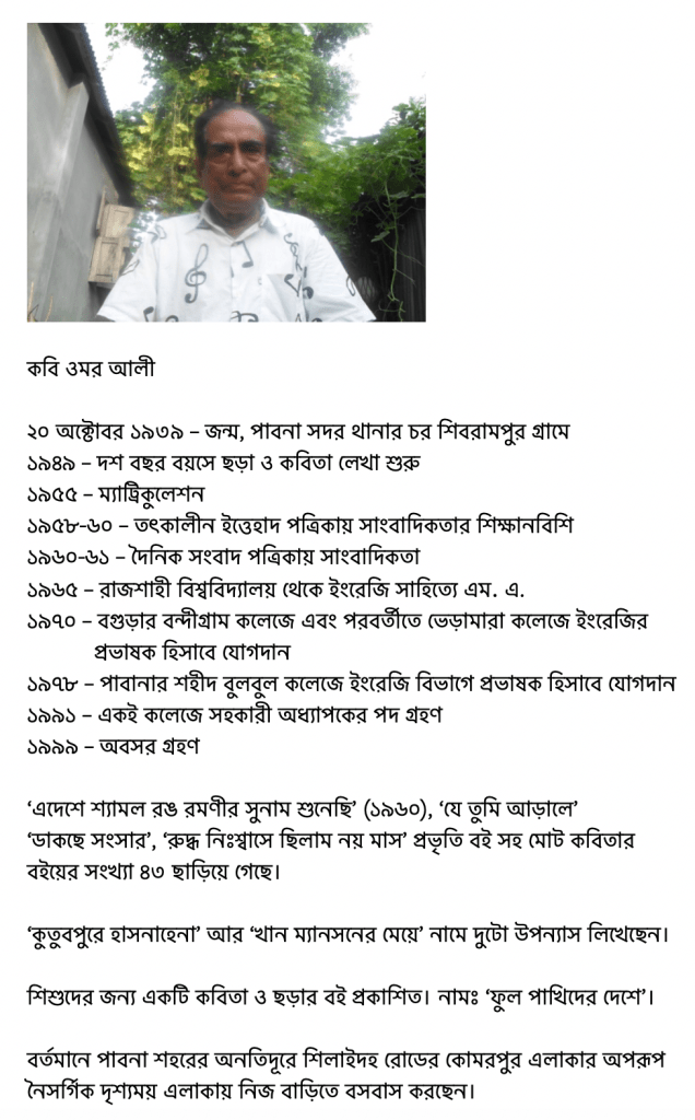 ওমর আলীঃ হ্যাঁ, আমিই ওমর আলী। আমিই কবি ওমর আলী। …মানে ও পাড়ে রবীন্দ্রনাথ আর এ পাড়ে ওমর আলী [কবি ওমর আলীর বাসস্থানের পাশ দিয়ে চলে গেছে শিলাইদহ রোড। মাইল দেড়েক পরেই পদ্মা। পদ্মার ওপারেই রবীন্দ্রনাথের শিলাইদহের কুঠিবাড়ি অবস্থিত]। আমরাই তো দুইজন কবি। এখানে আর কোনোও কবি নেই। হা… হা… হা…।
